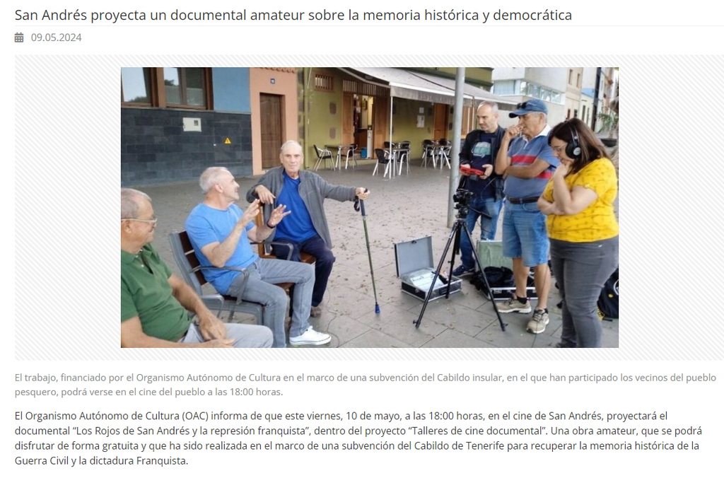 En este proyecto apoyado por Partipación Ciudadana del Ayto de La Laguna ha dado luz al encuento interegeneracional.Vecinos de Punta del Hidalgo, El Coromoto y La Verdellada participan en talleres de cine documental, los niños entrevistan y graban a los mayores.